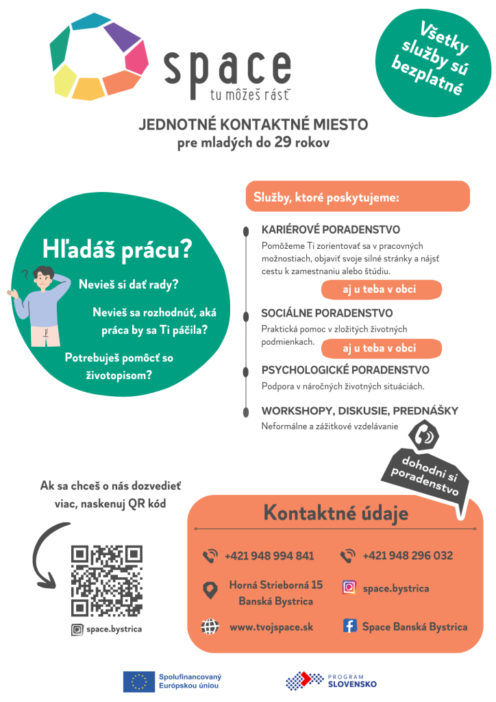 SPACE – jednotné kontaktné miesto pre mladých Banská Bystrica ponúka komplexné služby rozvoja, podpory a poradenstva pre ich plynulý prechod zo školy do zamestnania alebo návrat na trh práce. Venujeme sa najmä mladým nezamestnaným ľuďom v situácii NEET – osobám, ktoré nemajú zamestnanie, nevzdelávajú sa a nezúčastňujú sa na odbornej príprave – a mladým ľuďom ohrozeným situáciou NEET (napr. študentom základných a stredných škôl, vrátane žiakov so ŠVVP, ľuďom so zdravotným znevýhodnením, nízkym vzdelaním, príslušníkom marginalizovaných komunít alebo menšín a pod.).